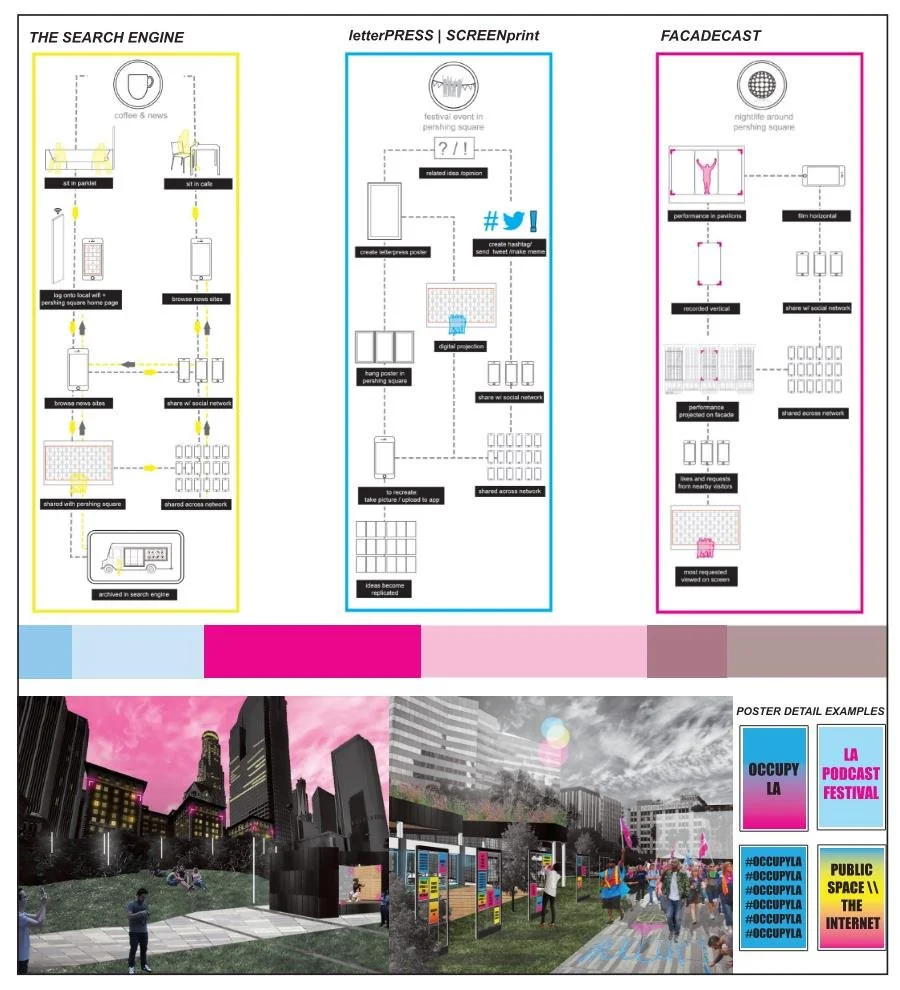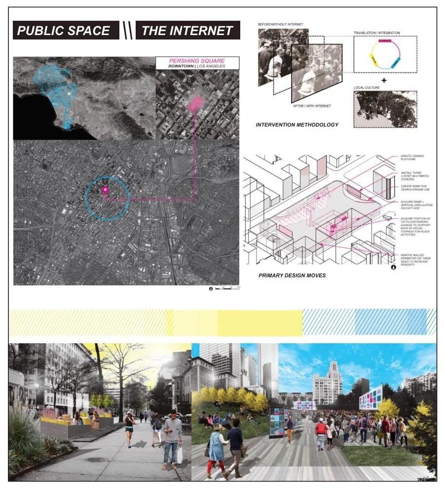 Public space is vital to urban society because it lies at the center of social and cultural life, however today the internet acts as a new centrality where fundamental connections between individuals and cultures occur in a new invisible setting. Today both physical and digital space serve as a vital interface for civic engagement and public participation. This project seeks to explore ways to both strengthen the significance of our online public interactions and enliven the urban public realm by translating digital cultures into physical relics within the urban environment. The design of the systems themselves were the focus of this exploration, giving physical and digital content the ability to flow between both worlds. Three situations are explored in the context of Downtown Los Angeles, centering focus on the redesign of historic Pershing Square: